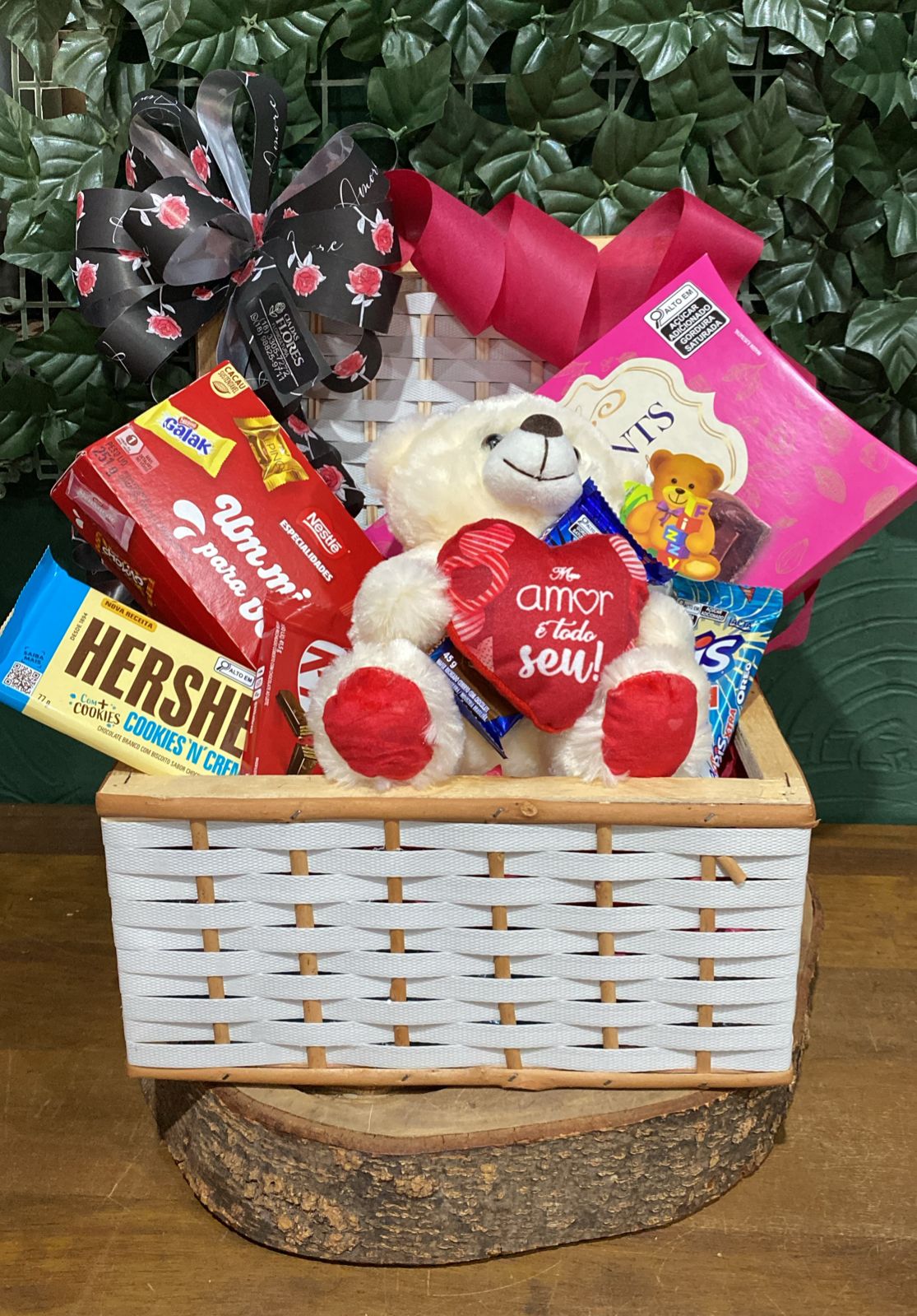 A Cesta Amor É Todo Seu é uma declaração de carinho em forma de presente. Com chocolates variados, um lindo ursinho de pelúcia segurando um coração com a mensagem “O amor é todo seu”, tudo acomodado em uma cesta elegante e decorada com laço especial, ela é perfeita para emocionar.