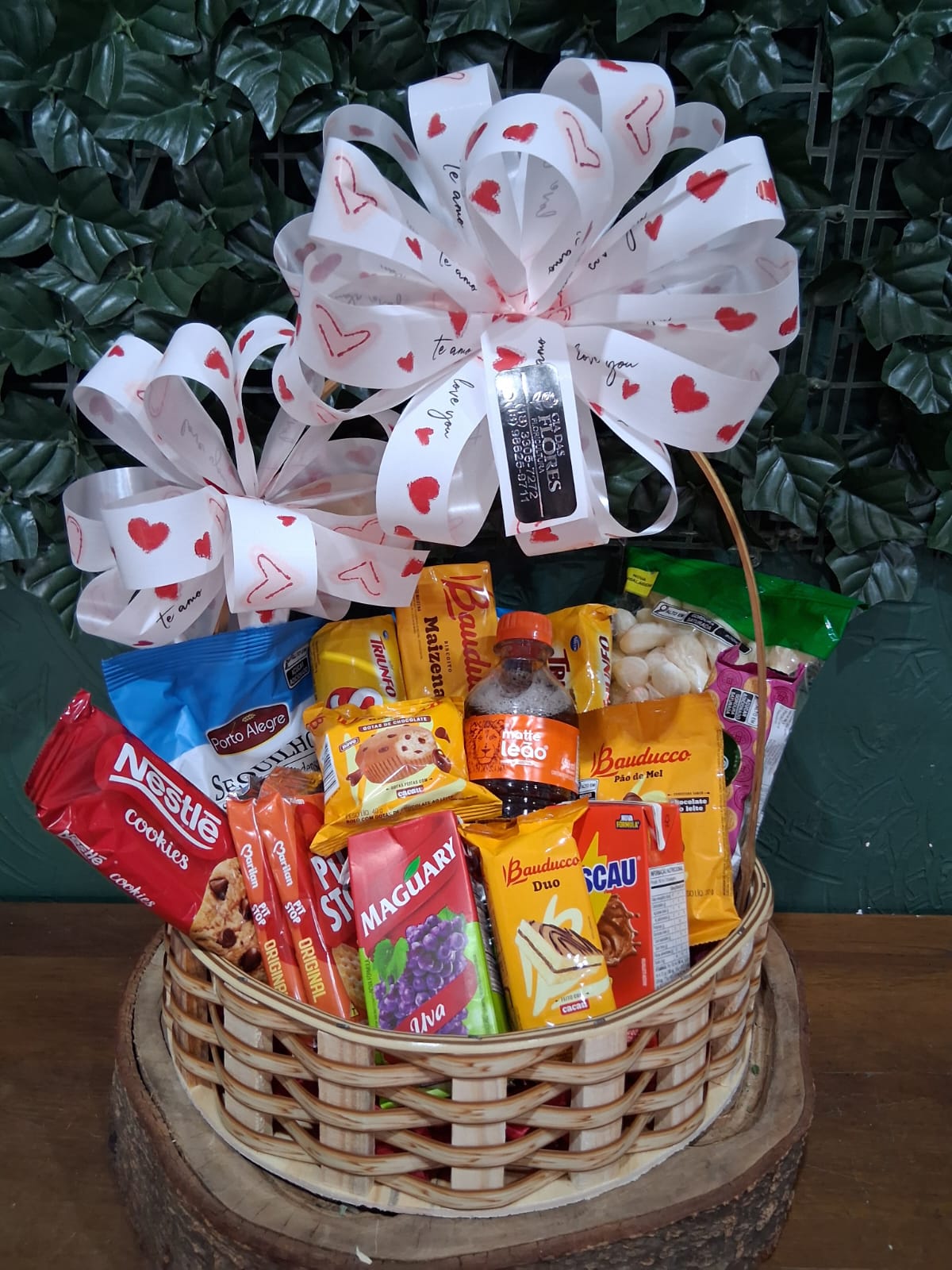 Cesta decorada, biscoito de polvilho, sequilhos, bolacha salpet,torrada,bolacha triunfo, bolacha   piraquê, bolacha de maisena, bolacha pit stop, bolinho bauducco, pão de mel, cookies,   achocolatado, suco e chá.