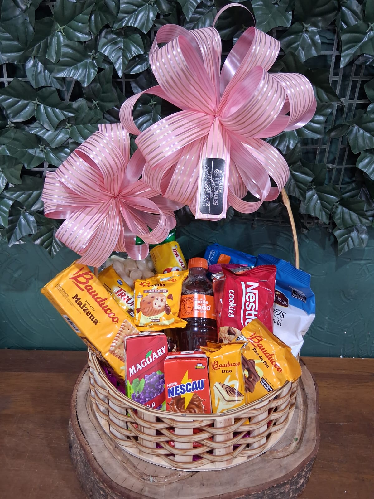 Cesta decorada, biscoito de polvilho, sequilhos, bolacha salpet,torrada,bolacha triunfo, bolacha piraquê, bolacha de maisena, bolacha pit stop, bolinho bauducco, pão de mel, cookies, achocolatado, suco e chá.