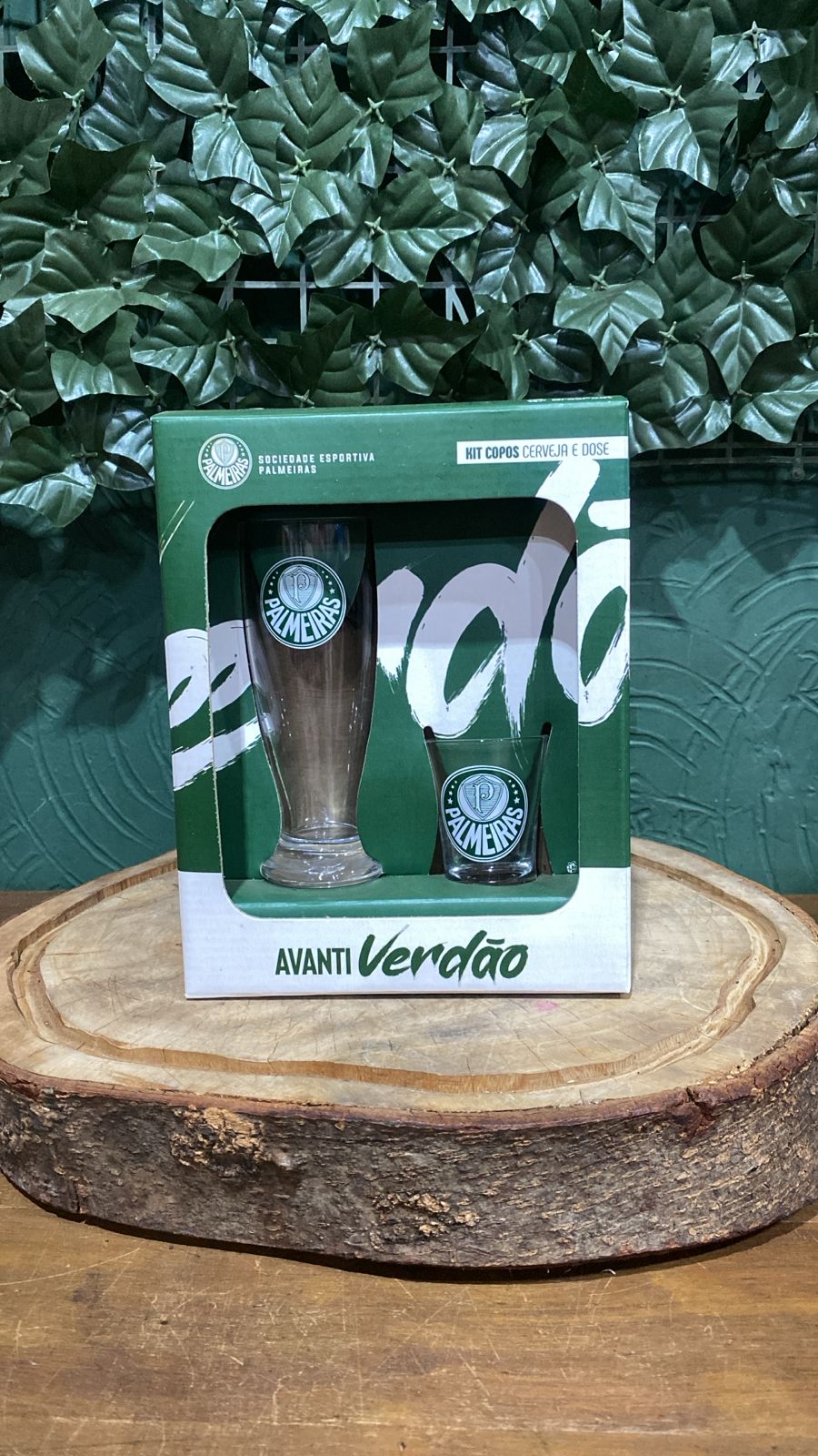Kit oficial do Palmeiras com dois copos: um copo de cerveja estilo pilsner e um copo de dose, ambos com o escudo do Verdão em destaque. Ideal para presentear torcedores apaixonados e perfeito para compor cestas e kits especiais da Cia das Flores. Um presente diferenciado para celebrar o amor pelo clube.