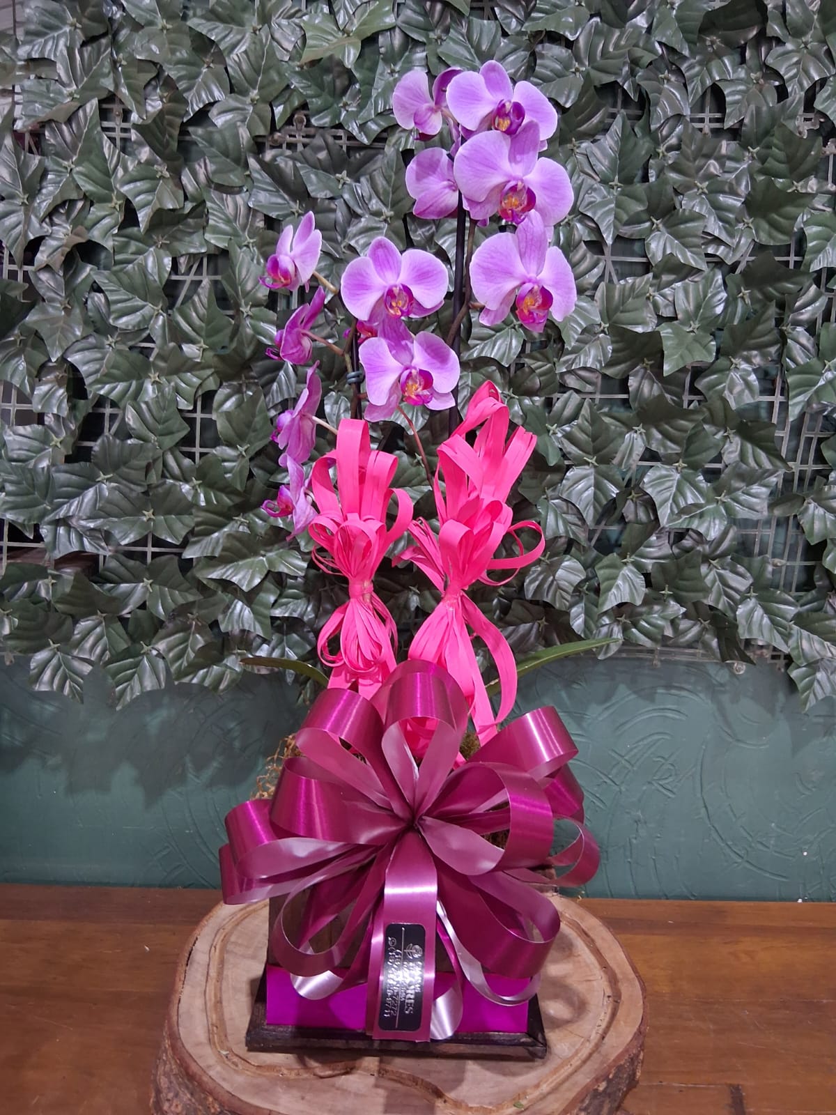 Orquidea 2 hastes + cachepô de madeira.